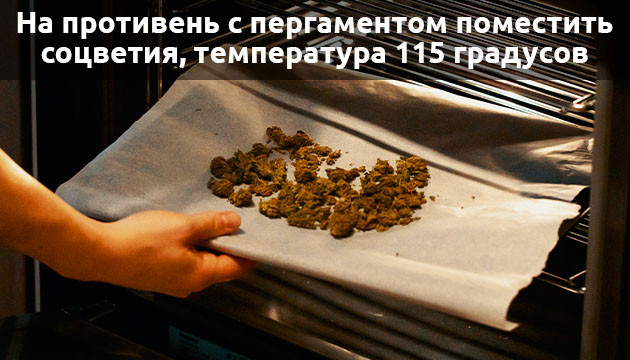 На противень, застеленный пергаментом или силиконовым ковриком, помещают измельченные соцветия. Когда духовка разогреется до 90-95 градусов, противень помещается внутрь, где ему предстоит находиться следующие 15-30 минут.