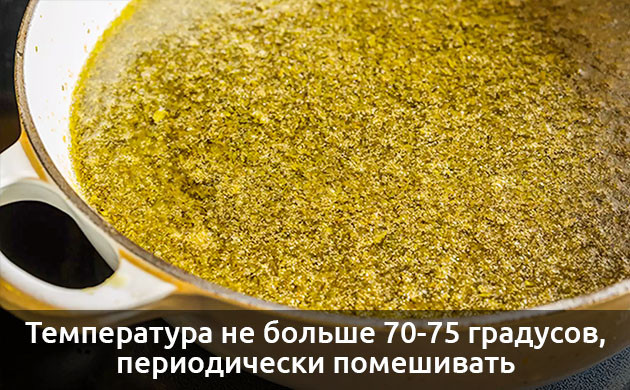 После этого следует строго контролировать температуру смеси. Она не должна превышать 70-75 градусов. Для этого лучше воспользоваться кулинарным термометром, который сейчас продается в любом хозяйственном магазине. Если же такой возможности нет, то огонь на плите лучше уменьшить до возможного минимума, а масло периодически помешивать, чтобы оно не доходило до полного кипения.