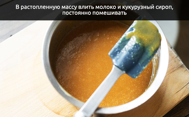 Внимательно следите за сахаром и его температурой, пока смесь находится на плите. Цвет сахара должен начать постепенно меняться от прозрачного к янтарному. Когда температура достигнет 160 °С, медленно по частям добавьте теплые сливки.