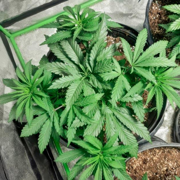 А вот и переход на цветение. Высота кустов за неделю увеличилась на 10 см, и после LST они выглядят просто шикарно, широкие, равномерные, заполняют бокс как надо. Перед сменой светового режима на 12/12 подержал растения пару дней под ДНаТ-лампой в режиме 18/6. Хотел, чтобы они немного выстрелили вверх перед переходом на цвет. В планах монстркроппинг, так что пусть сначала хорошенько разгонятся.