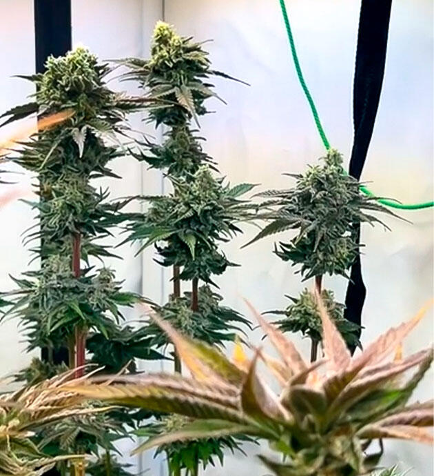 Помимо пары слегка подпалённых верхушек, все остальное выглядит идеально. Бутоны плотные, блестящие и покрыты толстым слоем смолы. Сейчас растения проходят промывку перед харвестом, а на выходные запланирован сбор урожая.