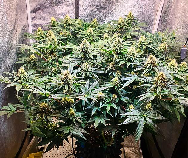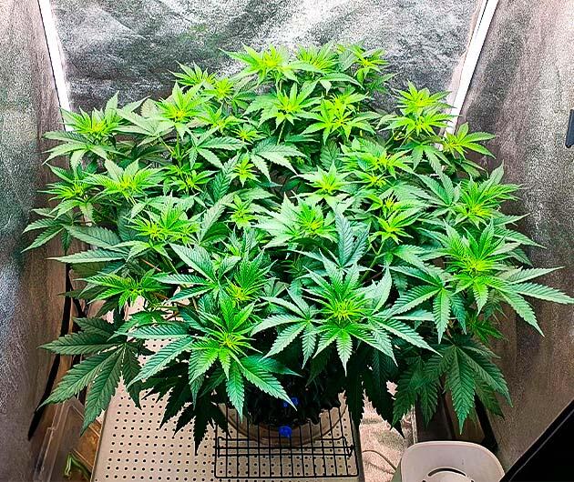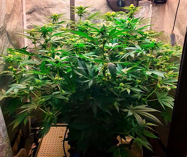 Седьмая неделя роста и вторая неделя цветения. Развел на эту неделю 18 литров компота с pH 5,85. Поливаю по-прежнему руками, т. к. сломался компрессор и пока ремонтируется. Пьет куст по 2,5 литра компота каждый день. Свет на этой неделе 40000-50000 lx, ~ 760-950 ppfd (неравномерный засвет по площади).