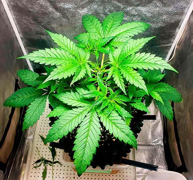 Идет четвертая неделя вегетации. Полив происходит каждый день по 1 литру. Растишка хорошо перенесла топпинг и набирает обороты далее. Свет на 22-й день 32000 lx, ~ 610 ppfd. Куст уже начинает попахивать, надо подключать угольный фильтр.