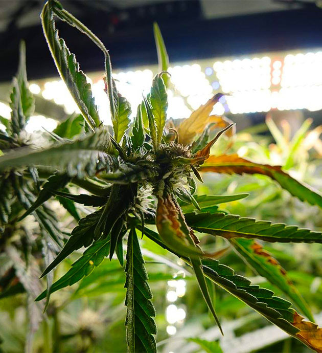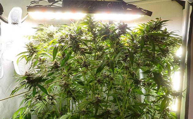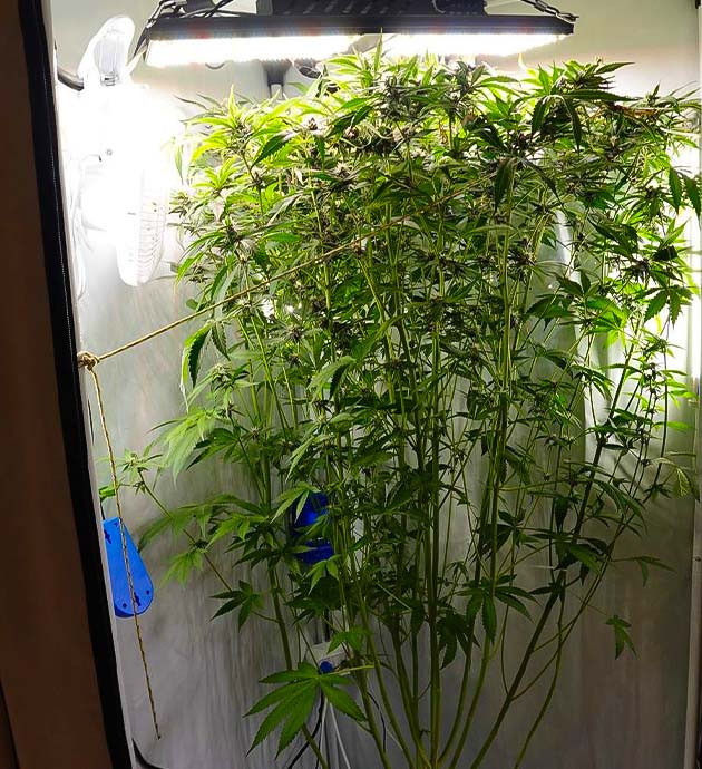 Ну что ж, я немного ошарашен, так как куст вытянулся настолько сильно, что на моей памяти такого еще не было. Всего за неделю он прибавил почти 50 сантиметров! Его рост 140 см. Поменял лампы на борд 240 Вт. Учитывая размеры куста, решил в каждом углу поставить еще по полосе диодов LM301H для бокового досвета этого монстра. Единственная проблема – макушки уперлись в лампу, что не есть хорошо. Некоторые из них подгорели еще от прошлых светильников, но в общем выглядят нормально. Заменил раствор в баке, перешел на HydroMax Bloom A и B. Разводил из расчета 2 мл/л каждого компонента. Получился компот 900 ppm. После того как заправил бак новым раствором, провел дефолиацию. Удалял как нижние листья и лопухи из центральной части куста, так и большие листья с макушки, чтобы они не закрывали свет. Обрезал довольно много нижних веточек, которые получали меньше всего света и от которых бы все равно уже не было бы никакого толка. Отмечу очень крепкий ствол и ветви.