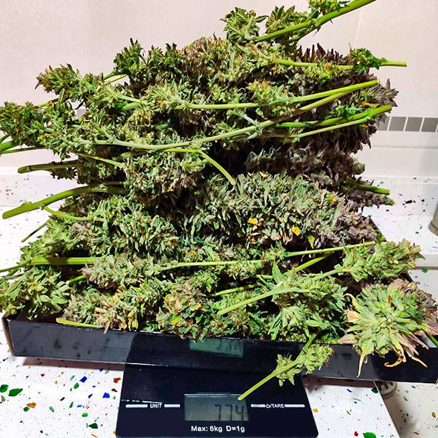После мокрого маникюра у меня на весах получилось 774 грамма свежего урожая, а после 8 дней сушки они преобразовались в 177 грамм готового продукта. Соцветия плотные и смолистые, но при этом само растение имело весьма умеренный запах, и мне кажется, при желании его можно выращивать даже без угольного фильтра. Свежие растения пахнут землей и сладостью, но прочувствовать всю гамму аромата можно только после хорошей сушки и пролечки. Именно тогда они открывают все свое волшебство.