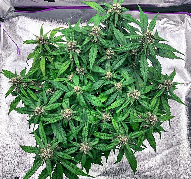 На девятой неделе растишка предстала передо мной во всей красе. Невысокий кустик с роскошными шишками, которые украшали всю крону. Насыщенный цвет, невероятный аромат, огромное количество смолы в соцветиях. Удалил несколько листьев, которые начали сохнуть. Поливал два раза по два литра.