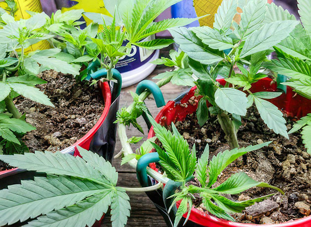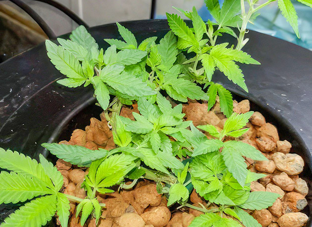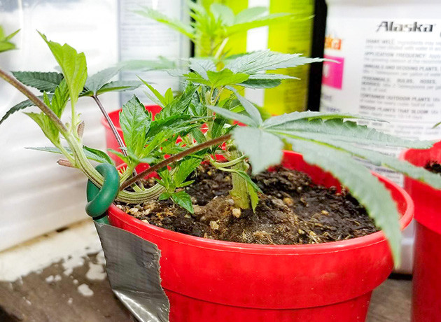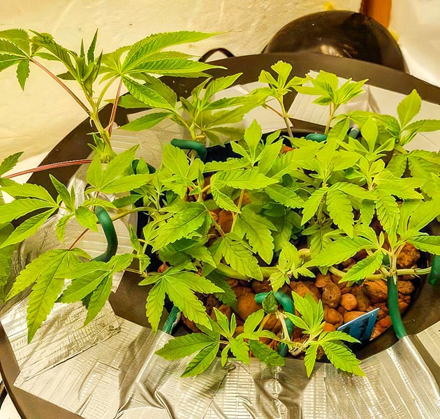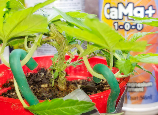 Итак, я высадил два черенка в небольшие горшочки с землей, дал им пару дней, чтобы пустить корни, и сразу начал тренировать. Я согнул их по кругу, чтобы открыть как можно больше мест для формирования новых побегов. Это чем-то похоже на бонсай, если не пересаживать их дальше. Пока они стоят на полке вне гроубокса под простенькой фитолампой, свет 18 часов в сутки, температура 21 °С днем и 20 °С ночью, влажность 35 %. Почву проливал заранее, на неделе после пересадки полив не понадобился.