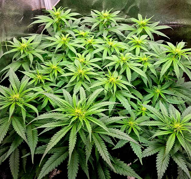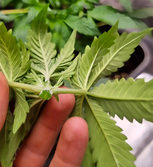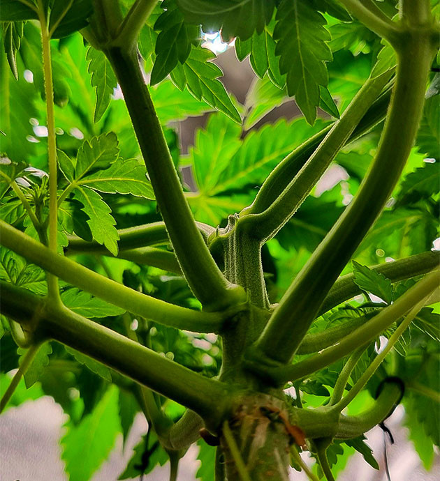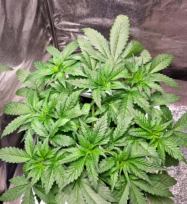 Bruce Banner Auto – настоящий зверь. Кто говорит, что автоцветы плохо переносят топпинг, просто не видели мой куст. Он продемонстрировал не просто быстрое восстановление после обрезки, а будто принял это как вызов и стал расти еще активней. Я сделал LST на боковые ветви, чтобы все части растения получали больше света, не закрывая друг друга. Куст абсолютно здоровый, ни малейшего признака каких-либо проблем или дефектов. Листва, ветви, главный стебель – все выглядят просто отлично. В начале недели поливал чистой водой, дал кусту два литра. Выпил быстро, почва просохла за два дня. После этого растение получило порцию воды с удобрениями. Разводил 4 мл на два литра воды. В конце недели еще раз полил чистой водой и заметил первые признаки предцвета. Действительно, впечатляющие темпы роста. Даже с учетом топпинга кустик уже близок к началу формирования соцветий меньше чем через месяц от каски.