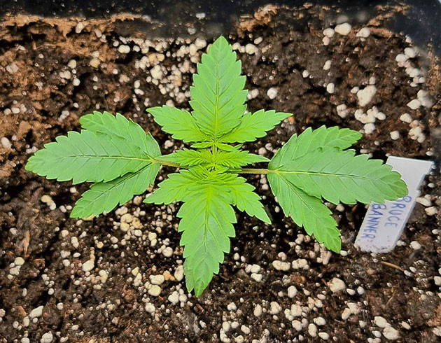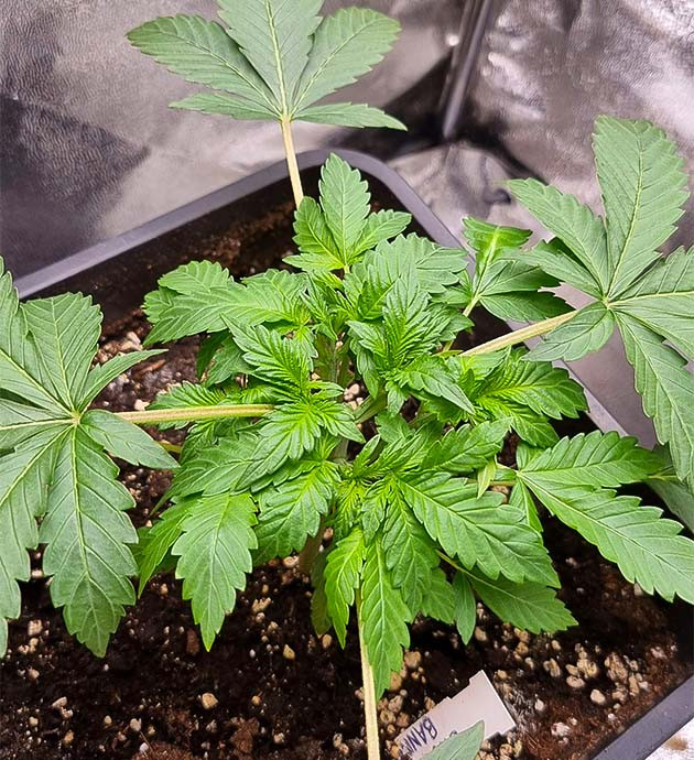 На второй неделе росток перестал тянуться, сформировался первый этаж, за ним быстренько вылезли пятипалые листики, и проклюнулся следующий этаж. Пока развитие ничем не отличалось от стандартного. Два раза полил «Брюса», в начале недели дал 500 мл и через 4 дня еще 500 мл. Растение выглядит здоровым, никаких замечаний.