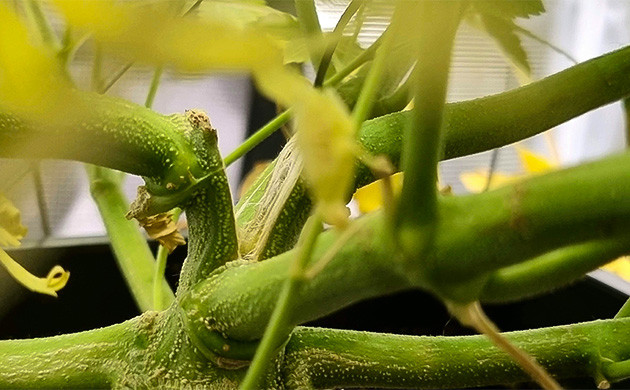 На восьмой неделе произошёл внезапный казус: ствол в месте топпинга, откуда растут два стебля, раскололся пополам. Увидел я это, когда делал фото в начале недели, и немного опешил. Но, учитывая его толщину и отсутствие признаков того, что ветви обламываются дальше, я принял решение ничего не предпринимать. Да и куст в целом выглядел отлично, соцветия продолжали набухать и уже приобретали хорошо знакомые формы. Полив, условия без изменений.