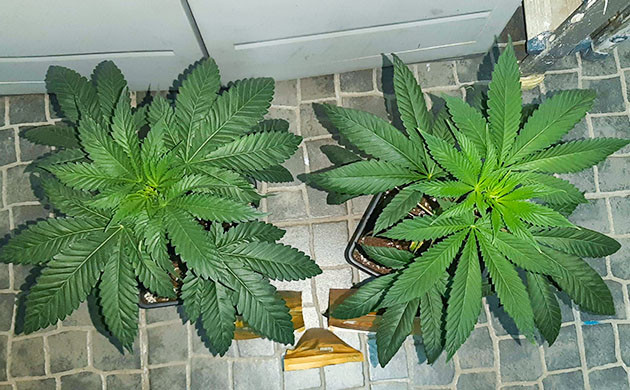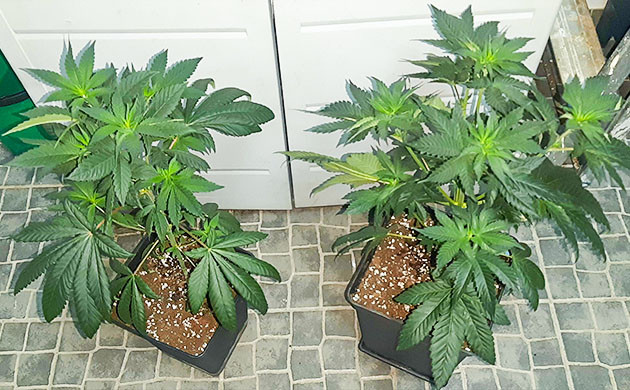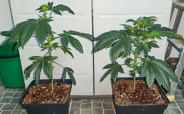 В начале шестой недели сделал топпинг на обоих кустах. После топпинга полил с BioEnhancer 0,4 мл/л при поливе 400 мл. После восстановления роста от топпинга стала заметна незначительная разница фенотипов, но так даже лучше. Стараюсь не заливать кустики, лью по 2-3 раза в неделю в зависимости от просыхания почвы. В целом никаких проблем, во многом за счет стабильности условий, умеренной подкормки и полива.