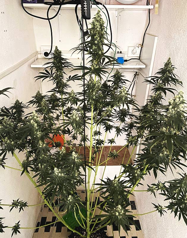 Бутоны действительно очень плотные на ощупь. Под их весом куст буквально разваливался и облокачивался на стены помещения, так что я решил обезопасить себя и подвязать самые увесистые колы к центральному стеблю. Выглядит не сильно надежно, но неделю до харвеста, думаю, продержит.