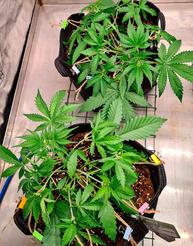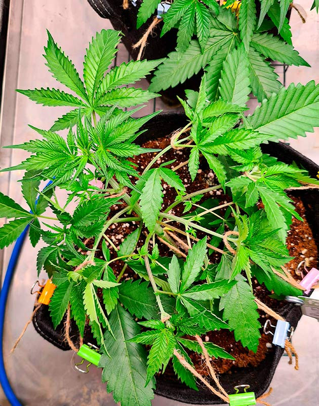 Cherry Cola Auto развивается просто замечательно. После LST веточки значительно вытянулись, после чего также были подвязаны-подогнуты в разные стороны. Получаются кустики с отличной открытой структурой и достаточно крепкими ветками. На этой неделе я удобрял растения один раз и дважды поливал чистой водой. Показатель ppm на дренаже – 300. Я не хочу сильно пичкать кустики удобрениями. Тем более никаких признаков дефицита не видно, развитие в норме. Судя по состоянию кустов, они скоро зацветут. Также на этой неделе я удалил часть листвы, по 3 пары с растения.