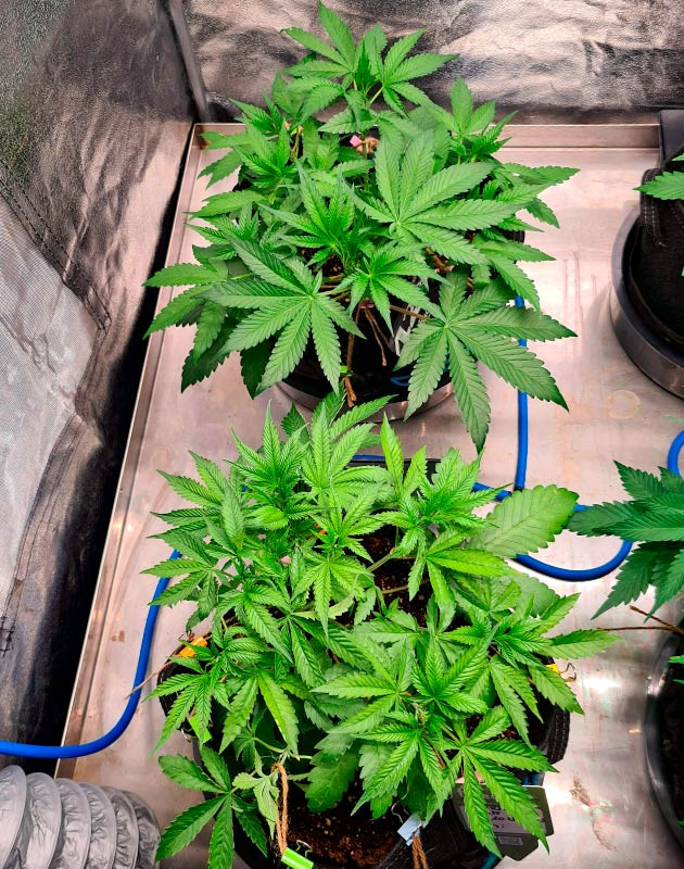 С пятой недели можно начать отсчет полноценного цветения. Кустики невысокие, за счет LST сформировали по несколько боковых ветвей, которые еще могут немного вытянуться. Конечно, я ожидал немного более высоких растений, но в целом все в порядке. Решил немного подрезать неперспективные веточки в нижних частях, чтобы растения не тратили на них свою энергию и лучше развивали соцветия. На этой неделе кормил два раза с Green House Feeding Grow и один раз поливал чистой водой. Условия в гроубоксе без изменений.