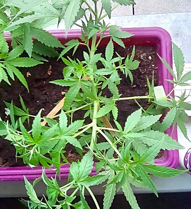 Благодаря тренировкам кусты растут более горизонтально, свет лучше проникает во внутренние части, за счет чего формируется больше макушек. Для понимания прогресса на одном из кустов размер палочек-распорок уже 11 сантиметров. В целом развитие идет своим чередом, по большому счету это только третья полноценная неделя, плюс нужно учитывать пересадку и топпинг. На неделе дал еще порцию компота и один раз поливал чистой водой.