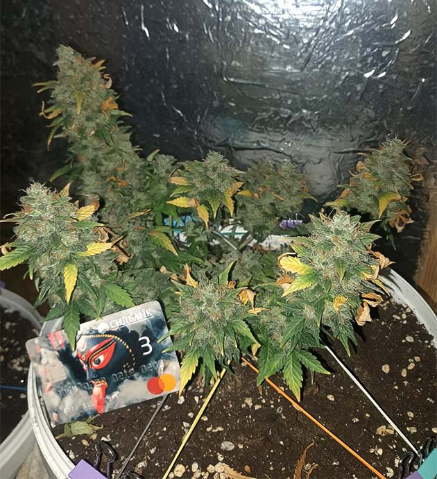 Немного об условиях грова. У меня небольшой самодельный гроубокс, в нём комфортно работать с двумя растениями. Использую горшки по 10 литров. Я считаю, это оптимальный размер для автоцветов, чтобы получить компактное растение, которому будет достаточно места для развития корневой системы. Для освещения использую обычные светодиодные лампы. На вегу стоят 9 штук 6400 К, на цветение меняю сетап на 9 штук по 2700 К. Земля – стандартная «Терра Вита», универсальная, плюс 30 % перлита. Небольшой вентилятор для обдува, внутри бокса установлена пара кулеров от ПК.