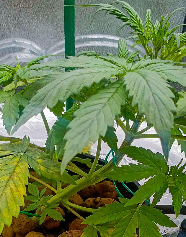 На третьей неделе одна из «Марий» показала пожелтевшую нижнюю листву. Видимо, последствия стресса. Верхние листья в порядке, развитие продолжается. Со второй «Марией» все хорошо. Начал бережную неспешную растяжку кустиков, чтобы успеть сформировать крону как следует. Света докрутил до 30К Lux.