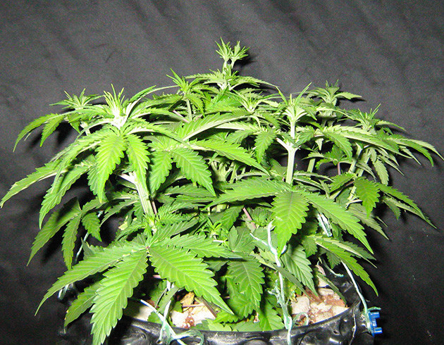В начале пятой недели (на 29-й день от каски) сделал топпинг на макушке. Через три дня немного растянул ветки в стороны. Девочка показала пол в середине недели, почти сразу после топпинга. С этого момента я начал периодически удалять по паре лопухов, но без лишнего энтузиазма. К концу недели начался предцвет, и я включил дополнительный светильник мощностью 36 ватт.