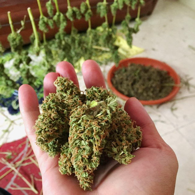 Рекомендую вырастить Big Satana Auto от Семяныча каждому гроверу, кто еще не знаком с этим сортом. Потрясающий автик, который созрел всего за 8 недель. Это даже быстрее, чем указано в паспорте растения. Конечно, можно было подержать куст еще неделю или две, но я не видел в этом особой необходимости. Шишки и так были большие, маслянистые и сочные, а трихомы мутные. С растихой не возникло вообще никаких проблем. Заходила гусеница, но ведь не в сорте дело, а в аутдорном грове. Никаких болезней, стрессов и прочих траблов. Справедливости ради отмечу, что я не тренировал кустик. Возможно, это повлияло на скорость созревания. В любом случае, итоговым количеством урожая я остался полностью доволен. С куста я получил 250 грамм свежего урожая. После сушки вышло 80 грамм готового продукта минус шишка, которая была срезана на пробу.