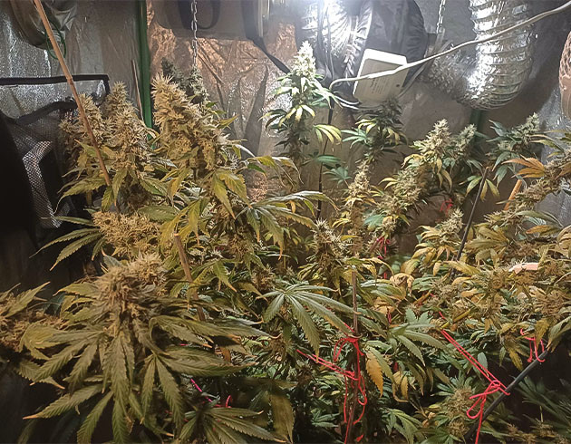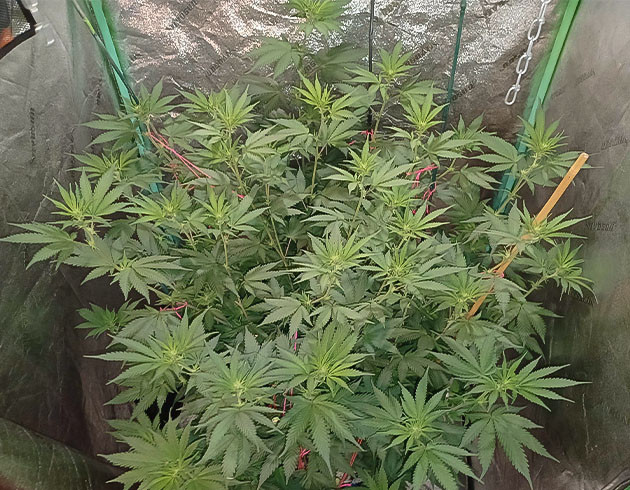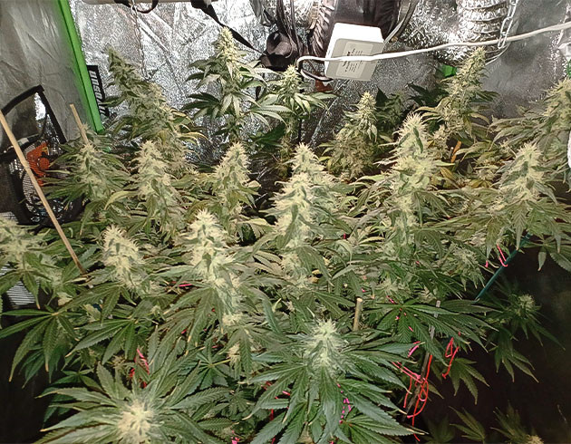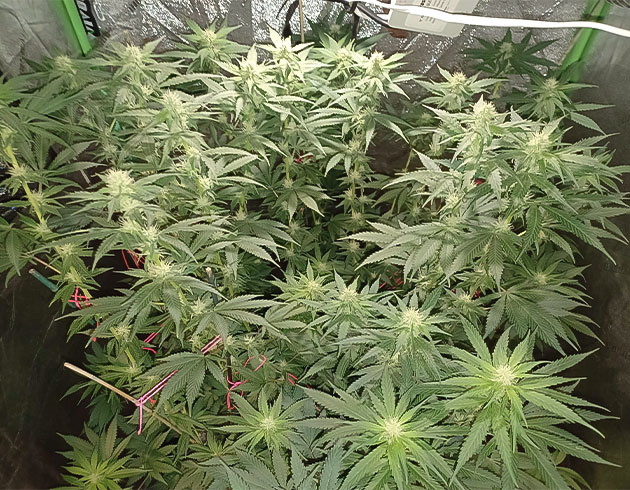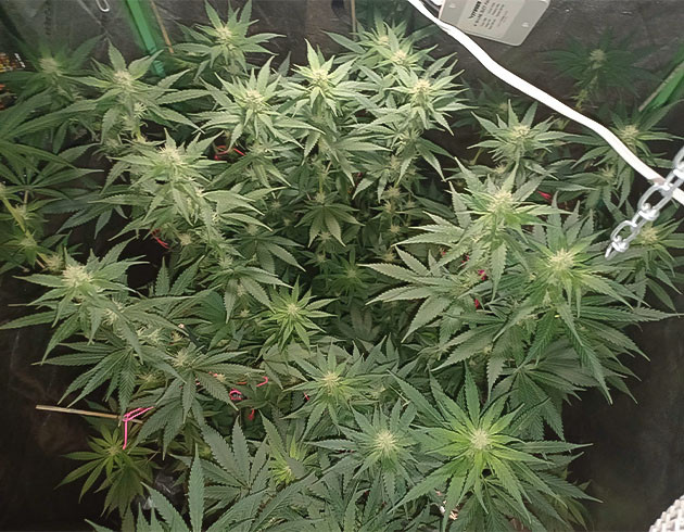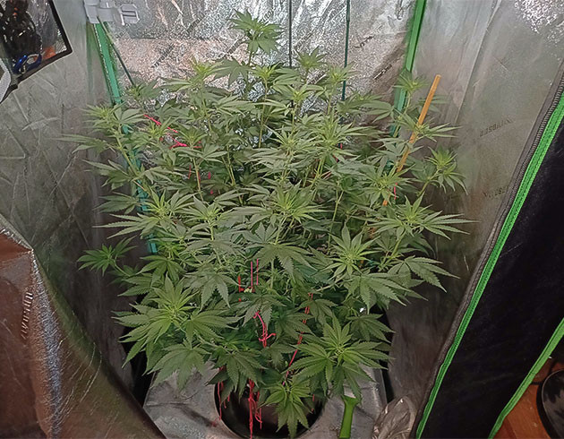Кустик выглядит хорошо, но к концу 14-й недели рост самых высоких макушек был 123 сантиметра, из-за чего приходится постоянно подвязывать ветви. На этой неделе два полива с «Блумом» и один без. Шишки покрываются смолой и уже сейчас выглядят аппетитно. Запах, кстати, довольно нейтральный, не слишком резкий, к моему удивлению.