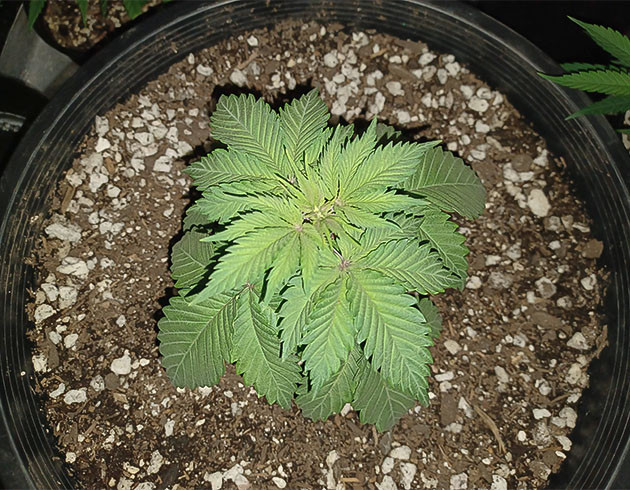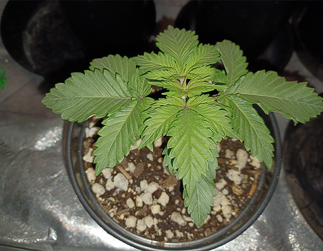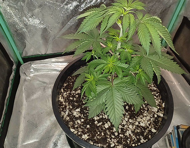 Следующую порцию воды с подкормкой растиха получила на 15-й день жизни. Поливал компотом с Sensi Cal-Mag Xtra и Grow Big по 1,3 мл/л каждого. Кустик сначала поник, а затем заметно взбодрился после полива и по моим прикидкам был готов к пересадке. В горшок на 25 литров раста переехала на 17-й день от семки и немного затормозила в развитии. Почва недостаточно просохла, и кустику было не совсем комфортно. До конца недели ситуация выровнялась, и моя индюха продолжила расти. Что касается влажности, то она плавает в пределах 30-40 %. Маловато, но раз с кустом всё ок, то и делать я ничего не буду.