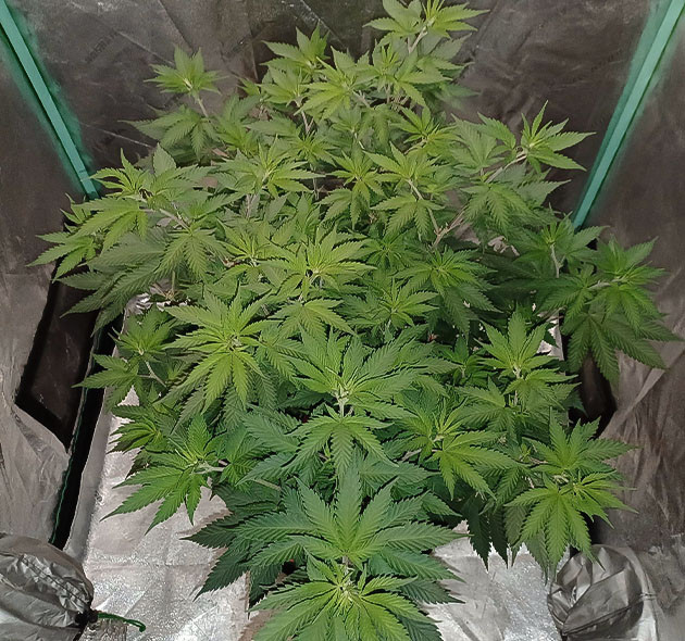 Девятая неделя, перевод в цвет, то есть смена светового режима на 12/12. К этому моменту рост куста по самой высокой коле – 66 сантиметров. Остальные плюс-минус той же длины. На 57-й день полив с удобрениями, Tiger Bloom 2,6 мл/л и Mammoth P 0,2 мл/л. Следующий полив на 59-й день с «КалМагом» и Mammoth P, без «Блума». На 61-й день полив с «Блумом» и через два дня еще один, но уже без «Блума». Получилось 4 полноценных полива за неделю. На 62-й день я заметил, что воздух в палатке очень спертый, а влажность невероятно подскочила. Причина была в забитом предфильтре, из-за чего кустик практически не получал свежего воздуха. Почистил, и всё встало на свои места.