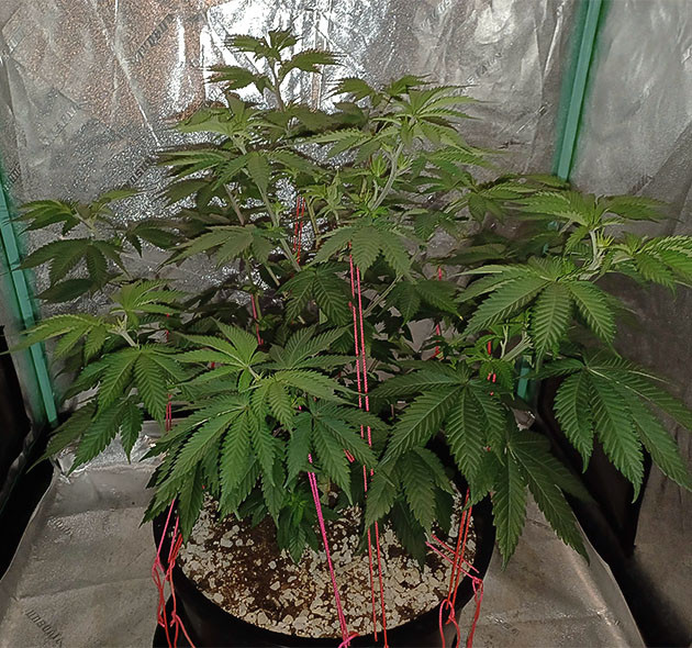 На следующий день после топпинга (43-й от каски) полив компотом. Концентрацию не меняю, увеличиваю только количество влитой жидкости. Кустик стал пить заметно больше, теперь раз в неделю поливать не прокатит. Сутки спустя подвязал-растянул ветки для формирования равномерной структуры. У куста получается очень много макушек, на которых будут расти шишки. 46-й день от каски, полив с Mammoth P и CalMag, но без Grow Big. А вот на 48-й день еще один полив, но уже с Grow Big. Полноценно кустик восстановился после топпинга только к концу недели, когда стали активно расти новые макушки.