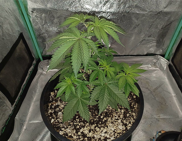 На 11-й день жизни кустика дал ему воды с CalMag от Sensi, концентрация 1,3 мл/л, pH – 6,5. Влажность в гроубоксе опустилась еще ниже, но растиха будто и не замечает этого. Если так пойдёт и дальше, то придётся принимать меры, пока же всё окей.