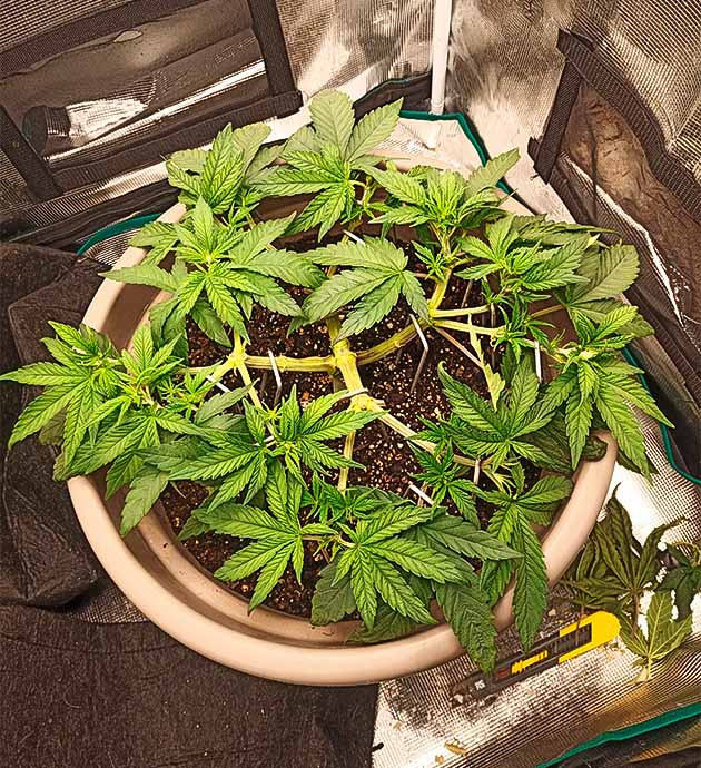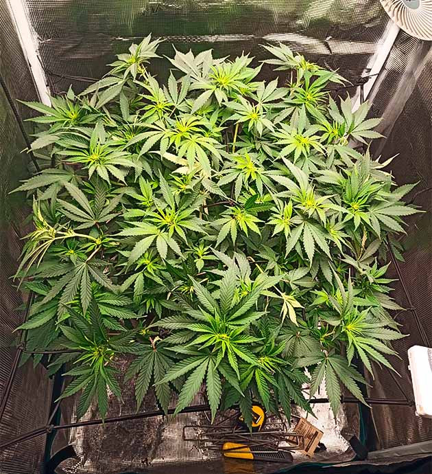 Проблемы с pH оказались серьезнее, чем я предполагал. К сожалению, я увидел это на листве растихи. В некоторых местах она начала как бы выцветать, становясь слишком светлой. Рисовый уксус не особо помогает, судя по всему. Впрочем, ничего страшного, так как новая бутылка pH Down уже едет ко мне и скоро всё наладится. А пока я установил сетку ScrOG, так как в ближайшее время планирую переводить кустик на цвет. Его рост около 25 сантиметров, если мерить по верхней макушке. Почистил растиху от лишней растительности под сеткой. Решил дать ей еще неделю, чтобы она окончательно сформировалась и была полностью готова к цвету. Теперь она пьёт по 1 литру за раз, два компота + 1 чистый полив за неделю: