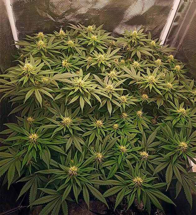 За десятую неделю растиха еще немного вытянулась и к 11-й расти перестала. Теперь на авансцену выходят шишки, которые приобретают более отчетливую форму. Растение заполнило всю сетку, пустых ячеек практически не осталось. В палатке стало заметно жарче, но в разумных пределах, температура не поднимается выше 27 °C. Также есть определенные нюансы с влажностью, она держится на уровне 55-57 %. Но у меня есть осушитель воздуха, так что не проблема. Схема полива прежняя, объём такой же, изменился только состав компота: