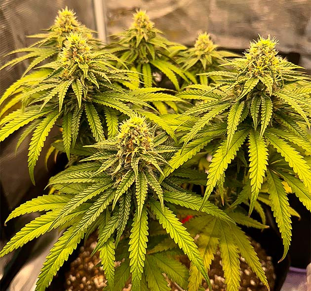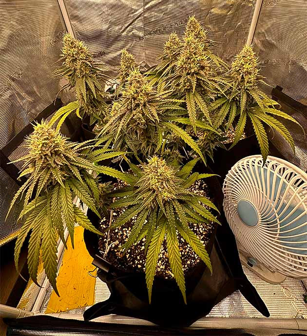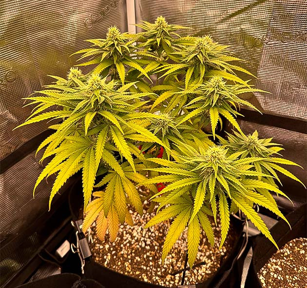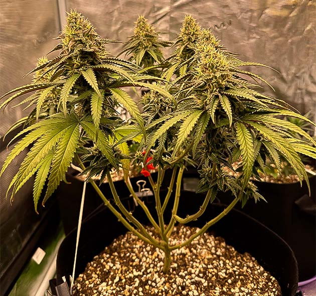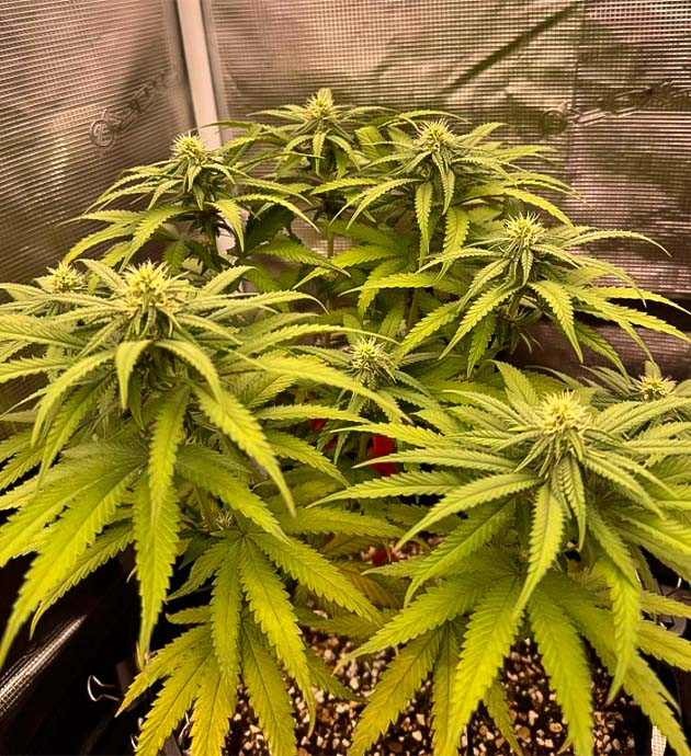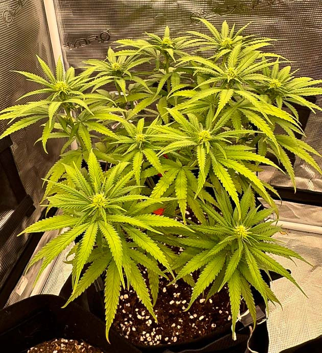 Следующие три недели я продолжал стабильный уход и применил LST-подгиб. Куст не выказывал никаких признаков стресса и хорошо реагировал на удобрения. Забыл до этого указать, что расстояние между верхушкой растения и лампой составляет 40 сантиметров. Также стоит отметить присутствие сильного травянистого аромата еще до начала цветения, что очень необычно для меня.