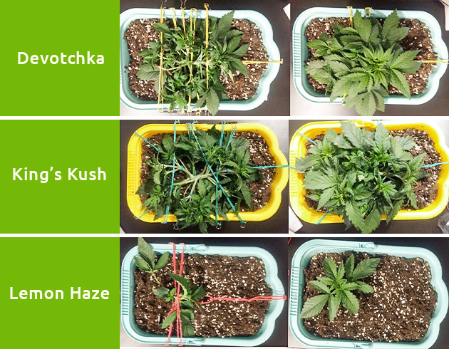 Как я и рассчитывал, “Девочка” восстановилась достаточно быстро, и я приступил к тренировкам. Саженец специально размещал немного сбоку ведра, чтобы растягивать по методике LST было удобней. Резинки, скрепки, тренировка официально началась. После 24 часов растяжения растиха получила литр “компота” c 0,1 мл Barrel и 0,5 мл Taste. Это не удобрения, а добавки, так что проблем с передозом возникнуть не должно. Убрал резинки на два дня, дал кустику немного восстановиться, а затем снова растянул. Всё идёт хорошо, но на паре листьев снова вылезли коричневые пятна, как и в первый раз после перелива. Решил просушить почву и пропустить один полив.