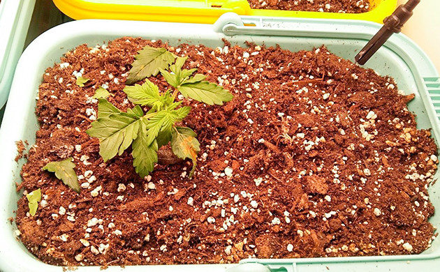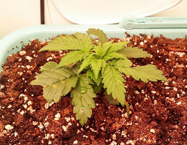 К отчету о первых двух неделях прилагаю фото общего плана для понимания размеров бокса и размещения кустов. Далее сфокусируюсь только на “Девочке”. Итак, световой режим 20/4. Влажность в боксе колеблется от 45 до 60 %. Температура днем 28 °C, ночью опускается до 22-23. Первая неделя прошла без проблем, а вот на второй неделе появились первые трудности. На первых листьях появились коричневые пятна. У меня две версии: либо это связано с передозом из-за заряженной почвы, либо я перестарался с поливом. Лил через день, крайний полив 100 мл, но почва была еще влажная. Склоняюсь именно к переливу. Не успел я решить эту проблему, как в бокс наведался мой кот и выбрал своей добычей именно “Девочку”, погрыз листву. Пушистый монстр. Повезло, что он не зацепил макушку, поэтому надеюсь на быстрое восстановление растихи.