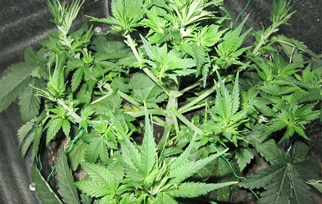 На 2-й день пятой недели от каски свет переведен на режим 12/12. Хорошенько подстриг листву, проредил куст процентов на 40-50, но оставил часть нижних лопухов. Поливал раз в два дня по 2 литра со слабой концентрацией буйских (5 мл/л). Растиха быстро пришла в себя от дефолиации и начала стрелять в рост.