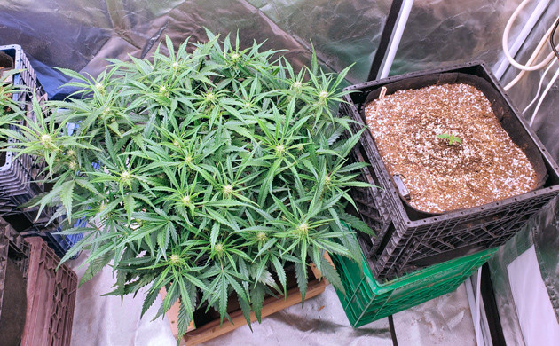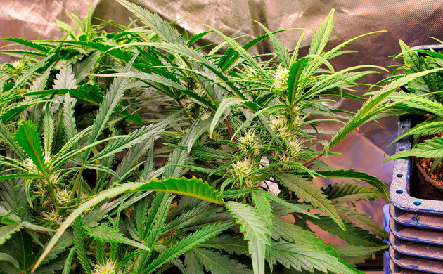 Я не перестаю удивляться этому автоцвету. Весь период развития растиха стоит в световом режиме 24/7 и чувствует себя отлично: подросла еще немного, а шишки стали постепенно набирать массу и становиться плотнее. Поливаю раз в два дня с тем же набором удобрений. Сделал еще одну дефолиацию, на кусте остались практически одни соцветия.