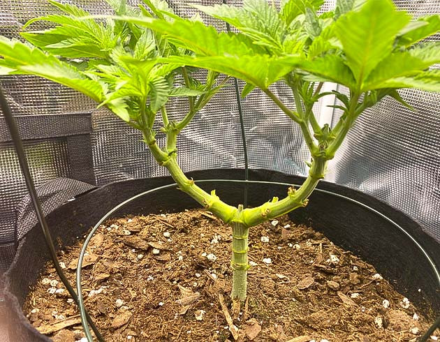 Второй росток, к сожалению, погиб. Считаю, что все-таки проблема заключалась в излишке питательных веществ. Поэтому для перестраховки я еще раз пересадил первый росток в еще больший горшок. Помимо этого, я подрезал верхушку, а также прибегнул к реализации техники мейн лининга. Высота растишки на данном этапе составляла 16 сантиметров.