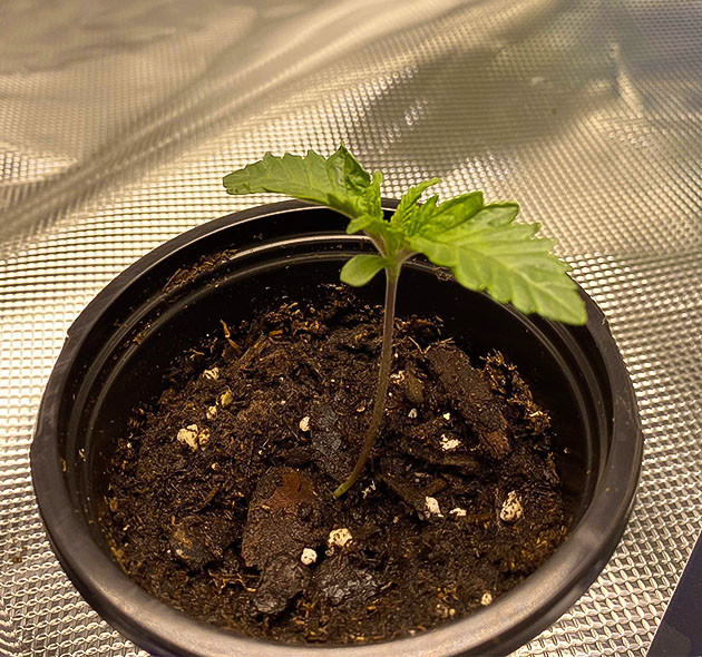 Итак, я прорастил два семени. Этот процесс прошел без проблем, все, как по инструкции. Посадил семена в небольшие горшки и поместил в гроубокс с примерной площадью в 1,5 м2. В качестве грунта использую Happy Frog.