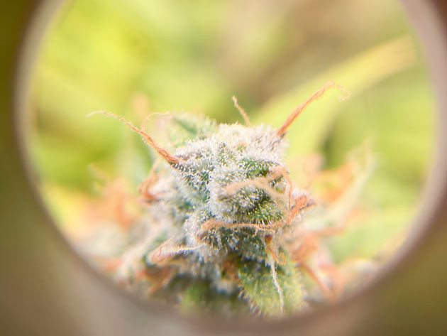 Шишки продолжают пухнуть. Выглядят великолепно, фотографии не передают всю их красоту. У них слегка фиолетовый оттенок, а на фоне желтеющих листьев он смотрится еще сильнее. Кустик на этой неделе начал получать еще немного больше удобрений, чем прежде, чтобы у него были ресурсы для финального буста:
