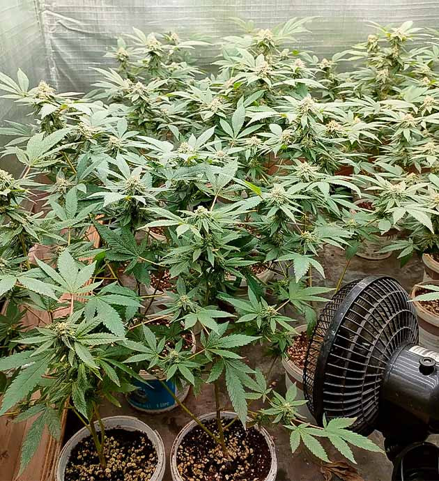 Девятая неделя была непростой. За окном 32-25 °C, в гроубоксе жарко, влажность же при этом высокая. Спасает обдув как внутри бокса, так и пара вентиляторов в помещении, где он стоит. Это последняя неделя на удобрениях, так как трихомы начали постепенно наливаться янтарем, а мне нужно около 10-15 % такого цвета. После этого кусты будут стоять в темноте, а затем пойдут под нож.
