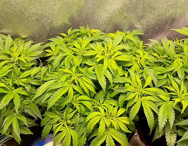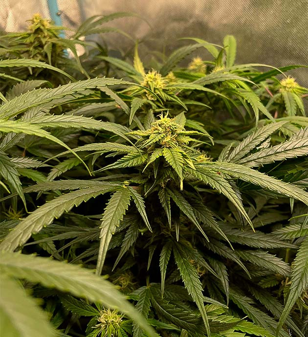 Седьмую неделю я обозначил для себя как начало предцвета. Я немного перестарался с подкормкой, судя по всему, так как на некоторых листиках стали появляться признаки ожога. Решил лить поменьше, убрал из компота «Калмаг», в остальном без изменений. К концу недели средний рост кустов составлял около 30 сантиметров.