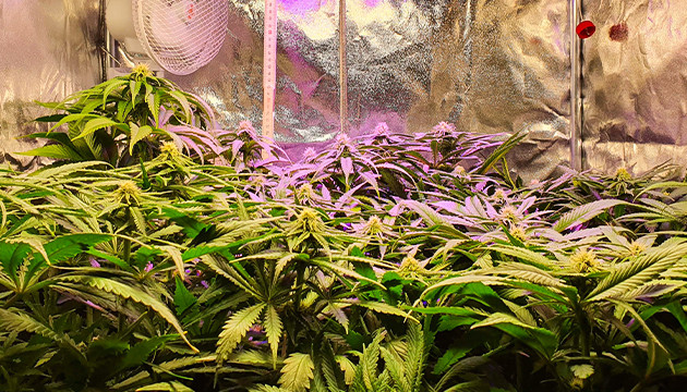 В начале пятой недели я сделал топпинг, немного согнул кустики и натянул сетку ScrOG. Очень доволен тем, какая получилась крона. Причем растихи стоят плотно друг к другу, прилично разрослись в ширину, и поэтому крона получилась практически однородной. Растения быстро восстановились от топпинга и продолжили расти. До сетки оставалось всего несколько сантиметров. Несмотря на то, что цветение еще не началось, в боксе уже появился запах.