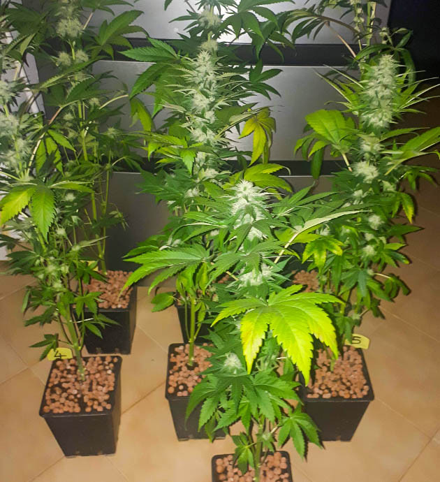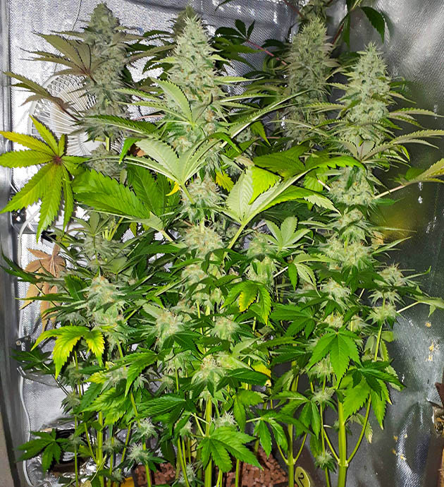 На 12-й неделе начали появляться первые оранжевые стигмы, трихомы на шишках пока прозрачные, небольшое количество мутных. С середины недели перестал давать удобрения, перешел на чистую воду. Решил срубить растиху номер 7, так как она не особо набирала в шишках и выглядела хуже остальных.
