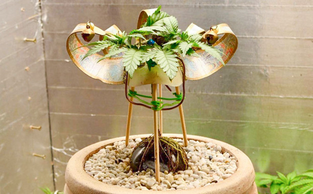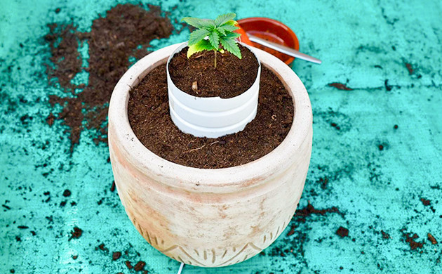 Для первых недель развития Grandmommy Purple я выбрал очень маленький горшок. Это нужно для того, чтобы корневая система сформировалась широкой, но не слишком ушла в глубину. Вообще, конопля предпочитает горшки большого объема, чтобы развивать мощные и длинные корни, которые разрастаются в поисках влаги и питательных веществ. Но для выращивания марихуаны по методике бонсай нужен именно маленький горшок. По крайней мере, для первых недель развития.