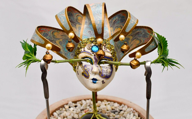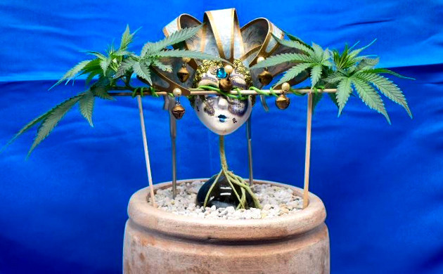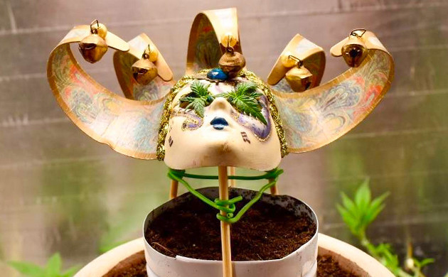 Надеваем маску на Grandmommy Purple. Прошло еще две недели, прежде чем растение было готово к следующему этапу тренировок. Я сделал топпинг и обрезал всю листву и узлы роста, кроме двух верхних. Над обрезанным кустиком я установил венецианскую карнавальную маску, теперь у двух макушек есть только один путь развития – через отверстия для глаз в маске.