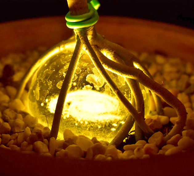 На четвертой неделе моя растишка была совсем небольшого размера, но время пересадки уже наступило. Grandmommy Purple была высажена в 7-литровый горшок, но при этом ещё дополнительно помещена в небольшой керамический сосуд, в котором расположена небольшая стеклянная сфера с крошечным LED-светильником под ней. Корни получились короткими и широкими, именно такого результата я и добивался.