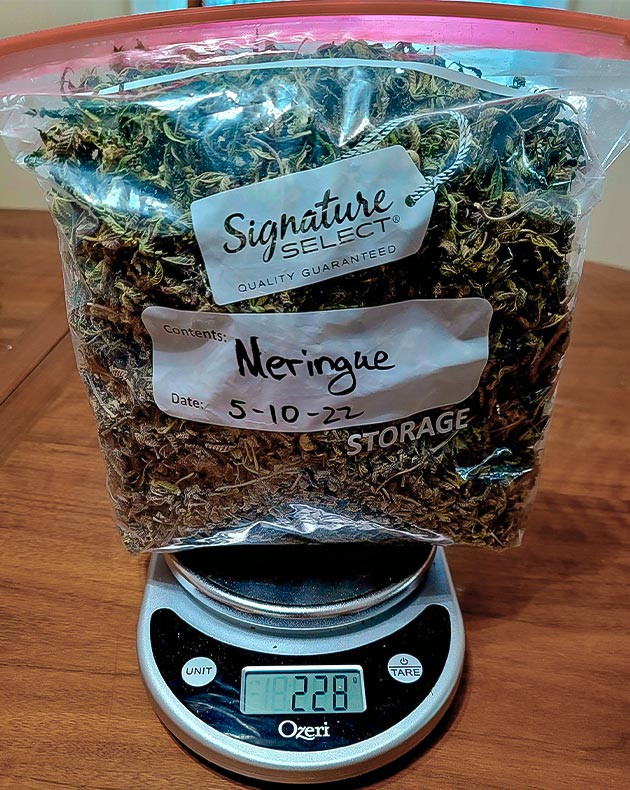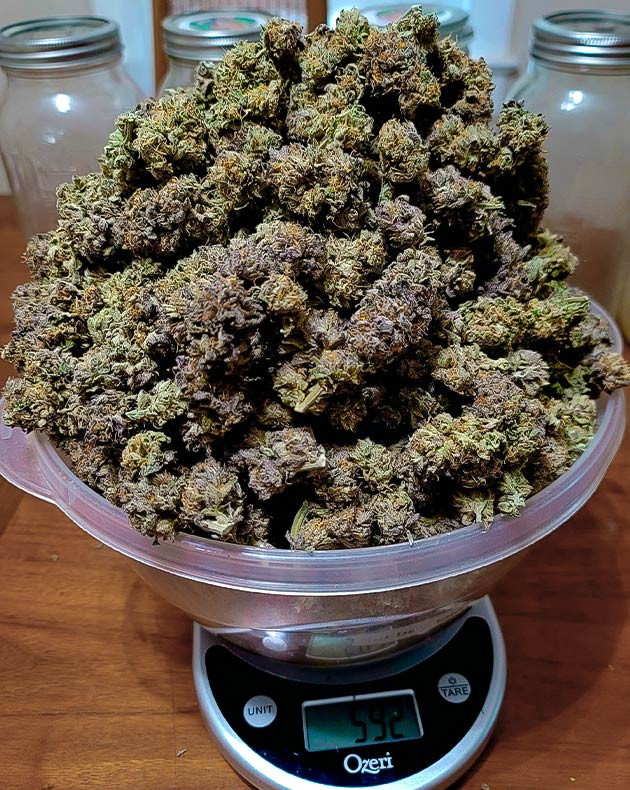 Если говорить об урожайности, то мне удалось собрать с одного единственного куста 1825 грамм свежих соцветий, которые после недельной сушки превратились в 820 грамм сухого продукта. 592 грамма – это крупные первоклассные соцветия, а еще 228 граммов – попкорн и сахарные листочки, которые будут пущены на приготовление концентратов.
