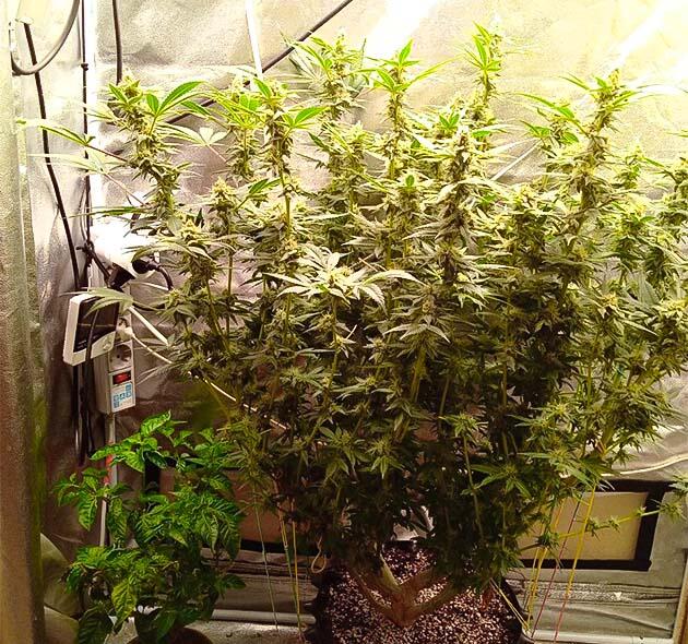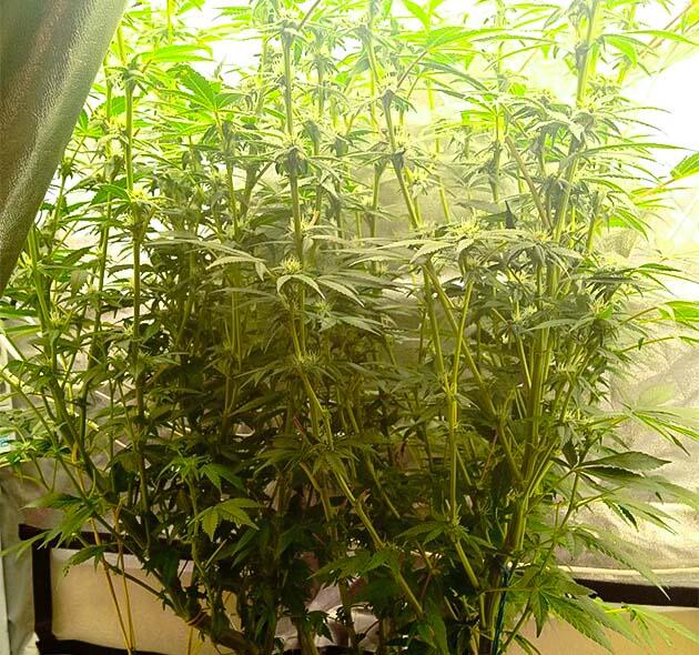 На протяжении шестой недели также растягивал растишку по боксу и убирал лишние притеняющие листы. Палатка эта уже под завязку заполнена зеленью, крона ровная, а высота всего 20 см от горшка. Можно сказать, что работа практически завершена. Скоро переезд в новую «избушку», еще немного тренировок, и на цветение.