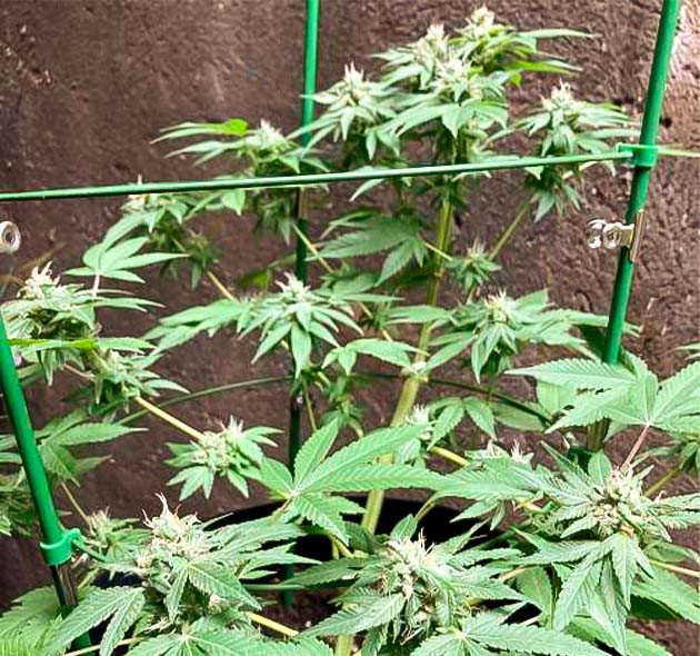 Визуально заметно ускорение в наборе массы соцветий, шишки стали не только увеличиваться, но и уплотняться, а их структура подтверждает преобладание индика-доминантных генов. Рост куста, в принципе, остановился на отметке 33 см с учетом подгиба и фиксации боковых ветвей. Компактные и смолистые колы благоухают сладковатым ароматом с землистыми и пряными нотками, фирменными для легендарной генетики Northern Lights 10 of 10. К концу второго месяца жизни куст уже нуждается в поддержке, тяжелые ветки начинают клониться под весом формирующихся соцветий. Чтобы побеги не сломались, установил подпорки.