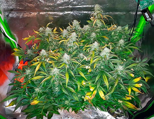 13-я неделя стала последней для растихи на удобрениях. Несмотря на то, что листва сильно высохла и пожелтела, оставить шишки без питания на финальном этапе созревания я не решился. В итоге я имею очень желтую и сухую листву, но крупные и плотные шишки. Хотя смолы на них не так уж много, скажу я вам. В аромате появились древесные нотки, но это всё еще конопляный запах практически в чистом виде.