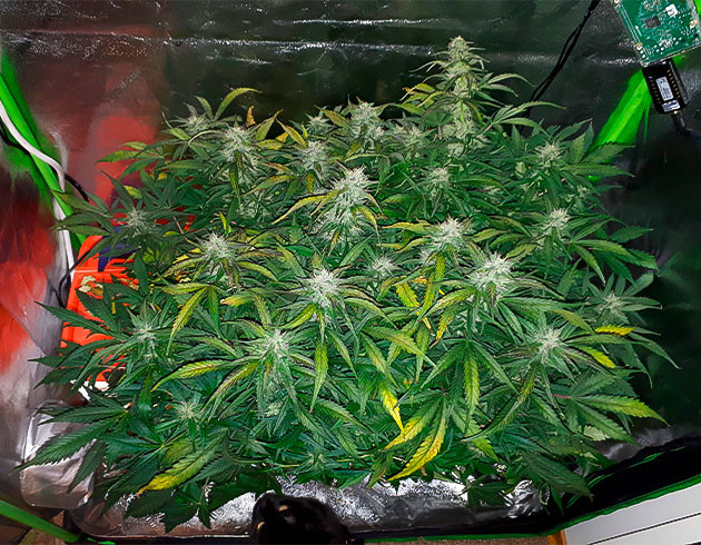 Кроме изменения светового цикла, условия в палатке не менялись. Влажность всё так же на 50 %, и хочу держать такую до конца грова. Борд висит на 40 сантиметрах от макушки куста. Сама растиха быстро отреагировала на изменения, я даже удивился. Думал, будет тормозить дольше. Но она справилась, и к концу недели уже показались первые усики-завязи будущих шишек.